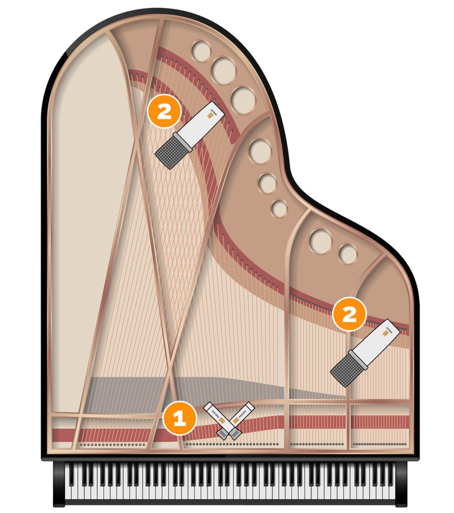 - oder in einer gemischten Position mit einem Mikrofon an den hohen Saiten und einem weiter vom Notenpult entfernten Mikrofon an den tiefen Saiten (Konfiguration Nr. 2 in der Abbildung oben). In diesem Fall ist der Klang der Hämmer etwas weniger stark wahrnehmbar.